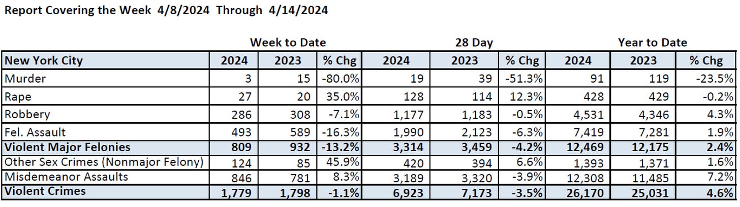 Despite the crowing of our leaders that “crime is down” for the year, if we include ALL assaults (not just felonies, which generally involve permanent disfigurement), as well as ALL sex assaults (not just Rape), NYC’s numbers for the year look like so: