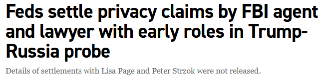 Meanwhile, former FBI employees Peter Strzok and Lisa Page — you know, of the “we have an insurance policy against Trump” Crossfire Hurricane hoax — not only never faced charges — they just got this news: